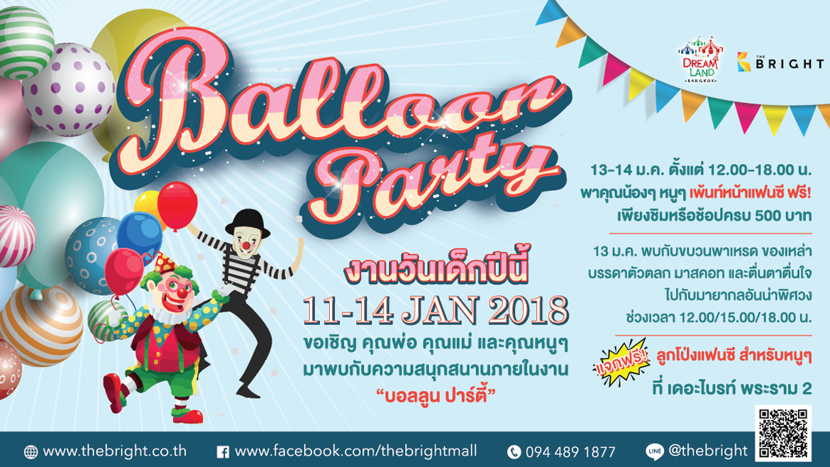 “งานวันเด็กปีนี้ 11-14 JAN 2018” ขอเชิญ คุณพ่อ คุณแม่ และคุณหนูๆ มาพบกับความสนุกสนานภายในงาน “บอลลูน ปาร์ตี้” 13 ม.ค. พบกับขบวนพาเหรด ของเหล่าบรรดาตัวตลก มาสคอท และตื่นตาตื่นใจไปกับมายากลอันน่าพิศวง ช่วงเวลา 12.00/15.00/18.00 น.