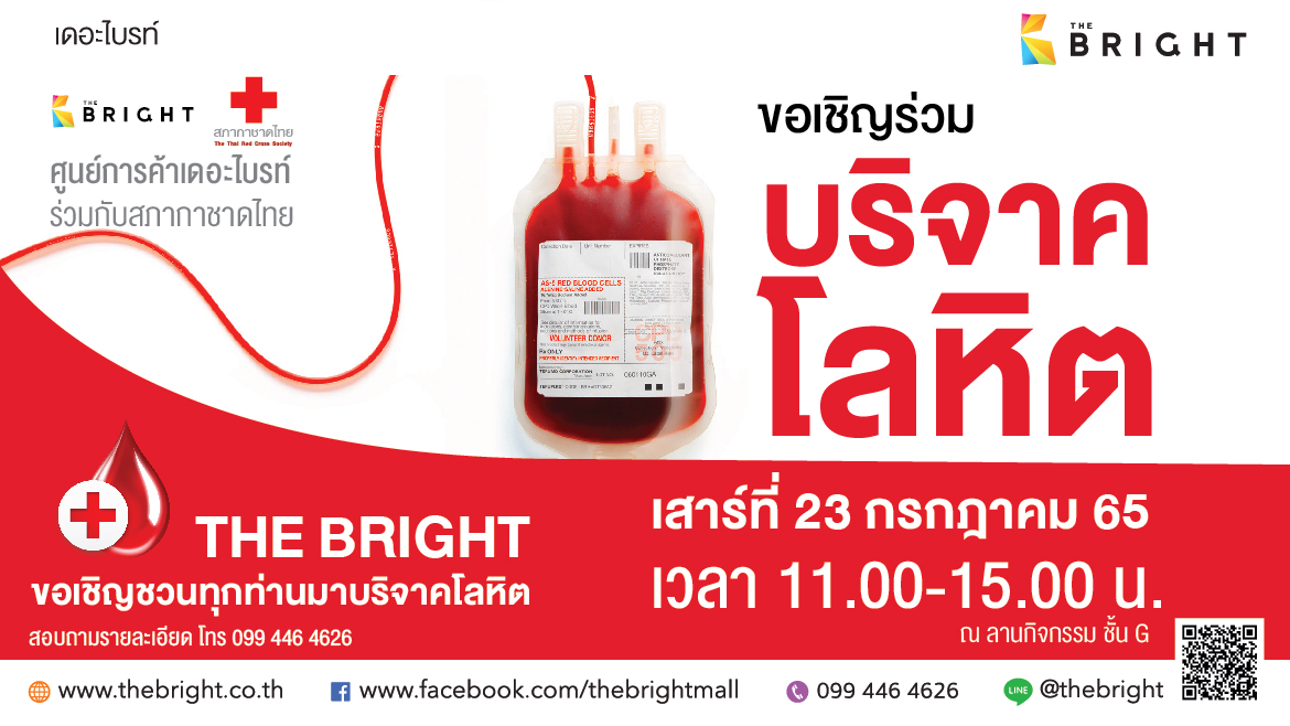 “THE BRIGHT ขอเชิญร่วมบริจาคโลหิต” ศูนย์การค้าเดอะไบรท์ ร่วมกับสภากาชาดไทย เสาร์ที่ 23 กรกฏาคม 65 เวลา 11.00 – 15.00 น. ณ ลานกิจกรรม ชั้น G สอบถามรายละเอียด โทร. 099 446 4626