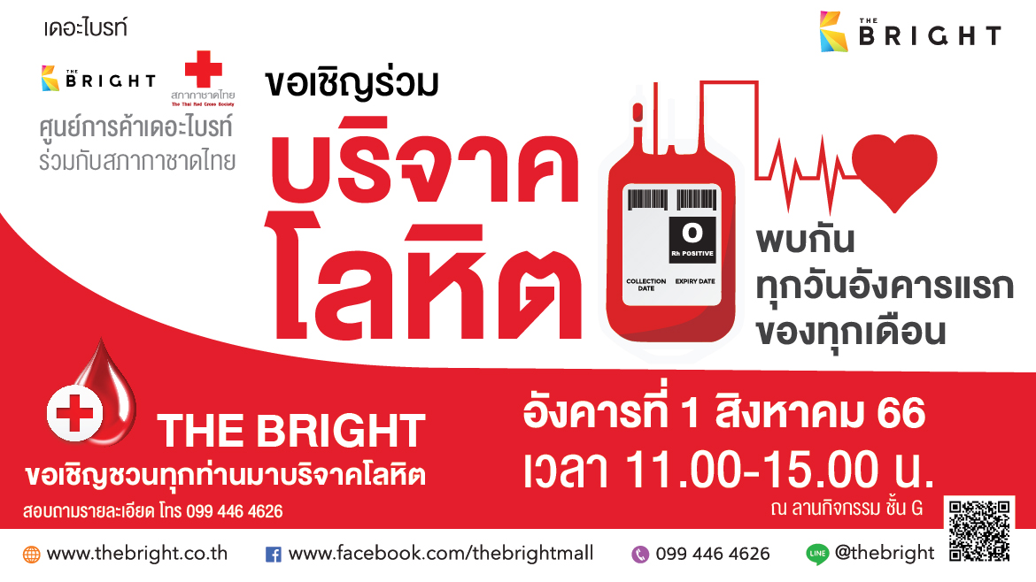 “THE BRIGHT ขอเชิญร่วมบริจาคโลหิต” ศูนย์การค้าเดอะไบรท์ ร่วมกับสภากาชาดไทย พบกันทุกวันอังคารแรกของเดือน อังคารที่ 1 สิงหาคม 66 เวลา 11.00 – 15.00 น. ณ ลานกิจกรรม ชั้น G สอบถามรายละเอียด โทร. 099 446 4626