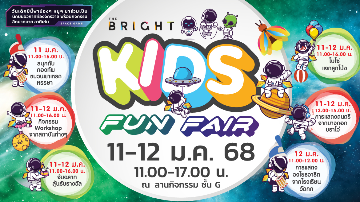 “THE BRIGHT KIDS FUN FAIR” วันที่ 11-12 มกราคม 2568 วันเด็กปีนี้พาน้อง ๆ หนู ๆ มาร่วมเป็นนักบินอวกาศท่องจักรวาล พร้อมกิจกรรมอีกมากมาย อาทิ เช่น สนุกกับกองทัพขบวนพาเหรดหรรษา, กิจกรรม Workshop จากสถาบันต่าง ๆ จับฉลากลุ้นรับรางวัล, โบโซ่แจกลูกโป่ง, การแสดงดนตรีจากบางกอกบราโว่, การแสดงวงโยธวาธิตจากโรงเรียนวัดกก เวลา 11.00 – 17.00 น. ณ ลานกิจกรรม ชั้น G