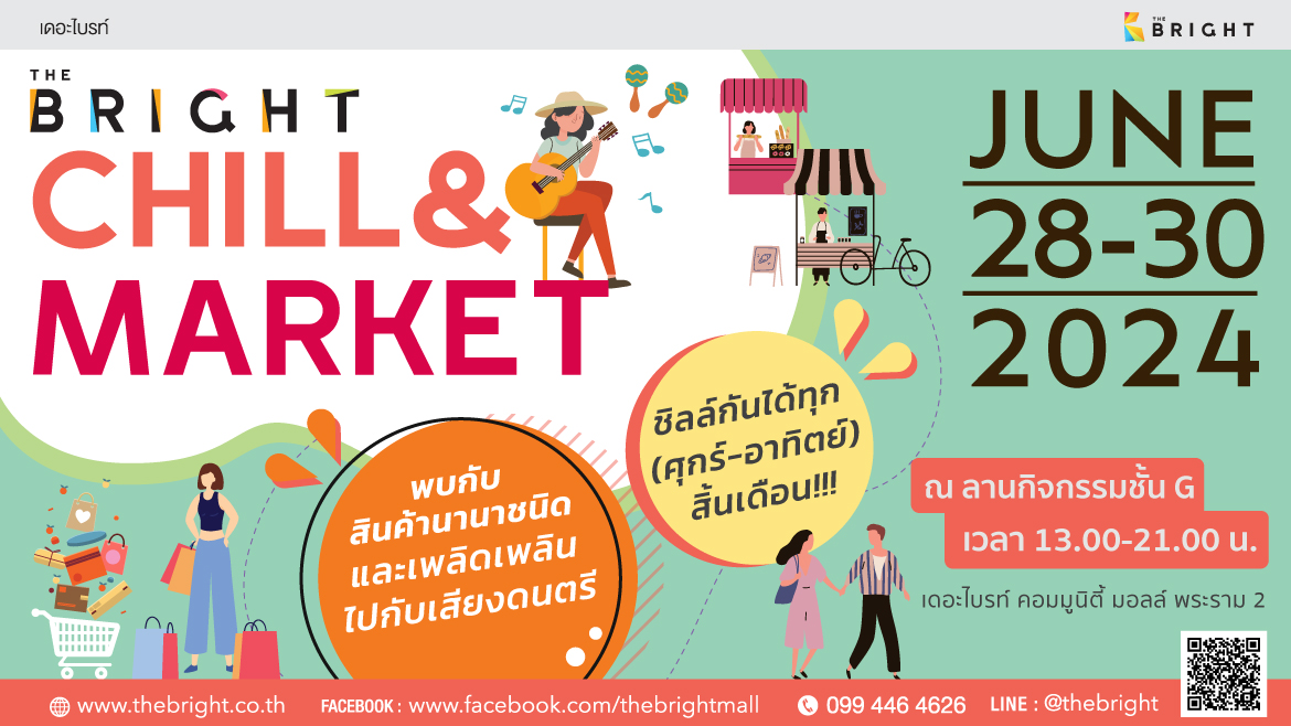 “THE BRIGHT CHILL & MARKET” พบกับสินค้านานาชนิดและเพลิดเพลินไปกับเสียงดนตรี วันที่ 28-30 มิถุนายน 2567 เวลา 13.00-21.00 น. Chill กันได้ทุกวันศุกร์-เสาร์ และวันอาทิตย์ สิ้นเดือน! ณ ลานกิจกรรม ชั้น G เดอะไบรท์ คอมมูนิตี้มอลล์ พระราม 2