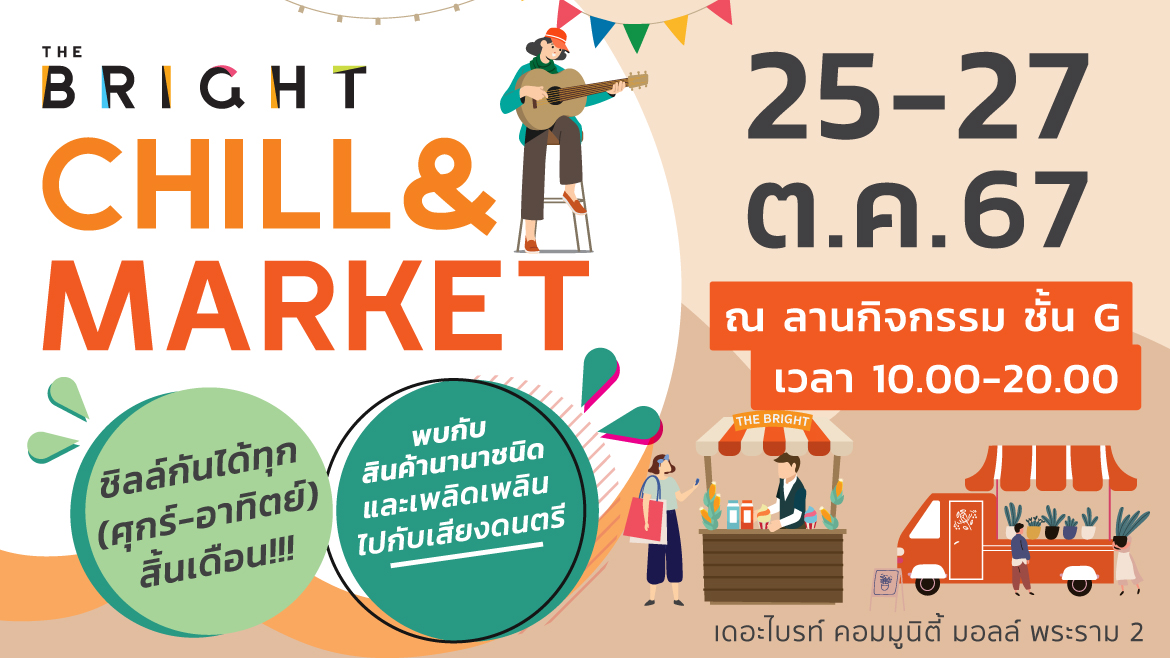 “THE BRIGHT CHILL & MARKET” พบกับสินค้านานาชนิดและเพลิดเพลินไปกับเสียงดนตรี วันที่ 25 – 27 ตุลาคม 2567 เวลา 10.00-20.00 น. Chill กันได้ทุกวันศุกร์-เสาร์ และวันอาทิตย์ สิ้นเดือน! ณ ลานกิจกรรม ชั้น G เดอะไบรท์ คอมมูนิตี้มอลล์ พระราม 2