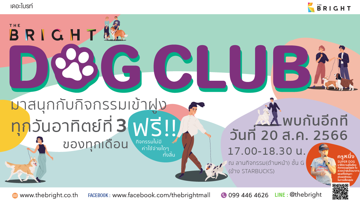 มาสนุกกับกิจกรรม “เข้าฝูง” ทุกวันอาทิตย์ที่ 3 ของเดือน “ฟรี!! ไม่มีค่าใช้จ่ายใด ๆ ทั้งสิ้น” ขอเชิญชวนทุกท่านนำน้องหมามาร่วมทำกิจกรรม ปรับพฤติกรรมพื้นฐาน ก่อนพาน้องหมาเที่ยวนอกบ้านพร้อมฝึกความสามารถเบื้องต้น โดย ครูหนึ่ง Super Dog วันที่ 20 สิงหาคม 2566 เวลา 17.00 – 18.30 น. ที่เดอะไบรท์ พระราม 2 ณ ลานกิจกรรม ชั้น G (ข้าง Starbucks Coffee)