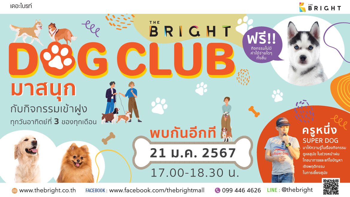มาสนุกกับกิจกรรม “เข้าฝูง” ทุกวันอาทิตย์ที่ 3 ของทุกเดือน “ฟรี!! ไม่มีค่าใช้จ่ายใด ๆ ทั้งสิ้น” ขอเชิญชวนทุกท่านนำน้องหมามาร่วมทำกิจกรรม ปรับพฤติกรรมพื้นฐาน ก่อนพาน้องหมาเที่ยวนอกบ้านพร้อมฝึกความสามารถเบื้องต้น โดย ครูหนึ่ง Super Dog มาให้ความรู้ในเรื่องกิจกรรมดูแลสุนัข ในช่วงหน้าฝนโภชนาการและแก้ไขปัญหาเชิงพฤติกรรมในการเลี้ยงสุนัข วันที่ 21 มกราคม 2567 เวลา 17.00 – 18.30 น. ที่เดอะไบรท์ พระราม 2 ณ ลานกิจกรรม ด้านหน้า ชั้น G (ข้าง Starbucks Coffee)