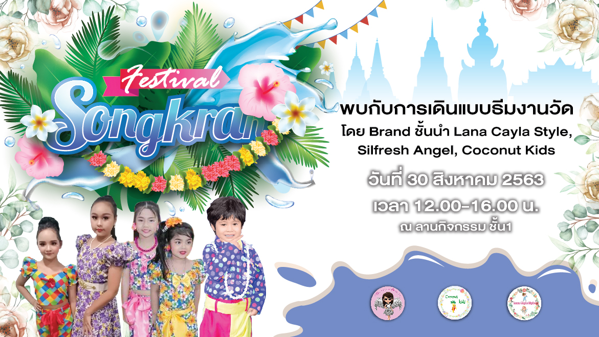 “FESTIVAL SONGKRAN” พบกับการเดินแบบธีมงานวัด โดย Brand ชั้นนำ Lana Cayla Style, Silfresh Angel, Coconut Kids วันที่ 30 สิงหาคม 2563 เวลา 12.00-16.00 น. ณ ลานกิจกรรม ชั้น 1