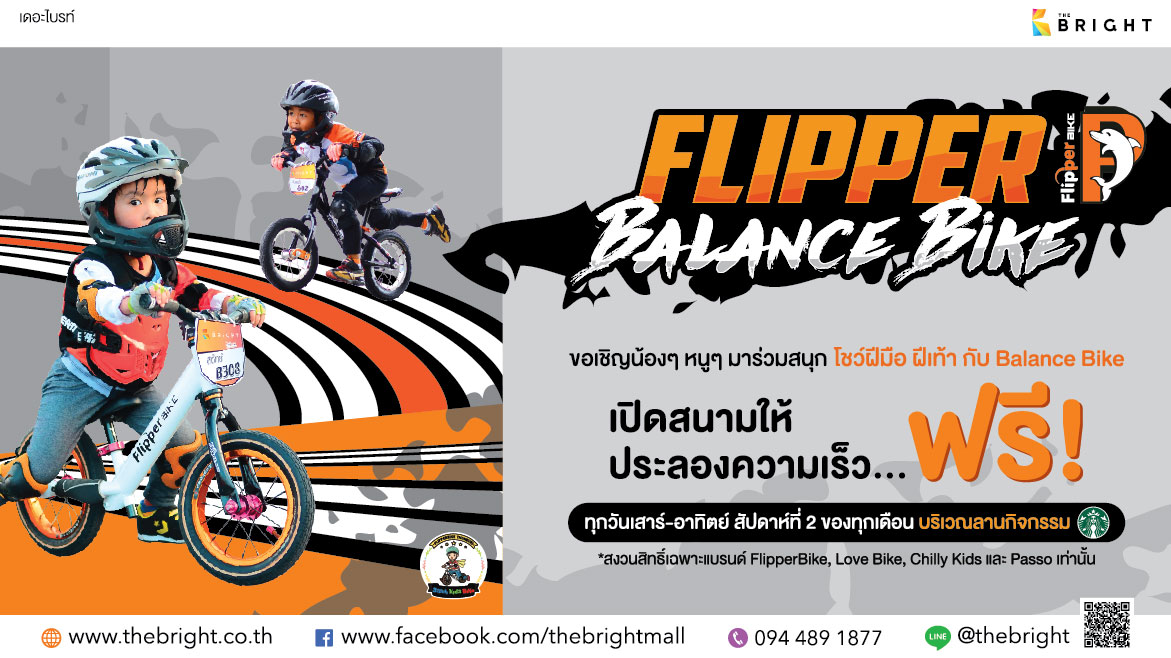 “FLIPPER BALANCE BIKE” ขอเชิญน้องๆ หนูๆ มาร่วมสนุก โชว์ฝีมือ ฝีเท้า กับ Balance Bike เปิดสนามให้ประลองความเร็ว …ฟรี! ทุกวันเสาร์-อาทิตย์ สัปดาห์ที่ 2 ของทุกเดือน บริเวณลานกิจกรรม STARBUCK COFFEE