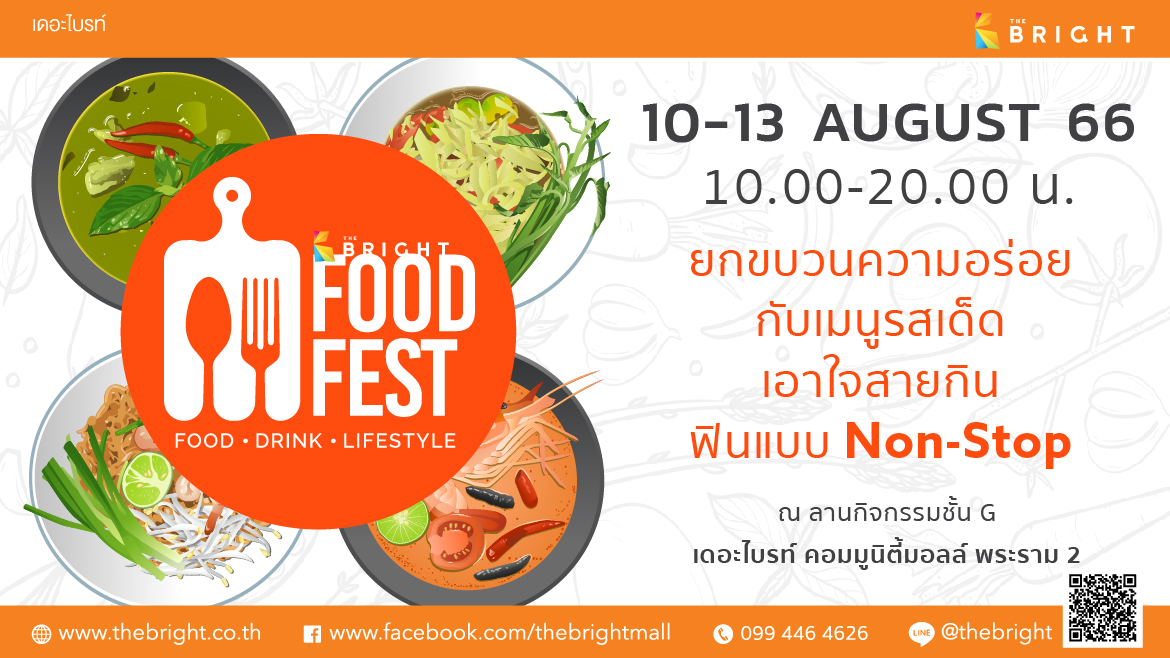 “FOOD FEST (FOOD-DRINK-LIFE STYLE)” วันที่ 10-13 สิงหาคม 2566 เวลา 10.00-20.00 น. ยกขบวนความอร่อยกับเมนูรสเด็ด เอาใจสายกินฟินแบบ Non-Stop ณ ลานกิจกรรม ชั้น G เดอะไบรท์ คอมมูนิตี้มอลล์ พระราม 2