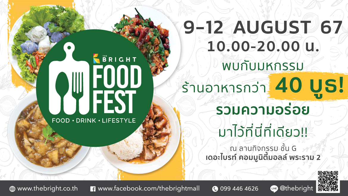 “THE BRIGHT FOOD FEST : FOOD – DRINK – LIFESTYLE “ วันที่ 9-12 สิงหาคม 2567 เวลา 10.00 – 20.00 น. พบกับมหกรรมร้านอาหารกว่า 40 บูธ รวมความอร่อยมาไว้ที่นี่ที่เดียว ณ ลานกิจกรรม ชั้น G เดอะไบรท์ คอมมูนิตี้มอลล์ พระราม 2
