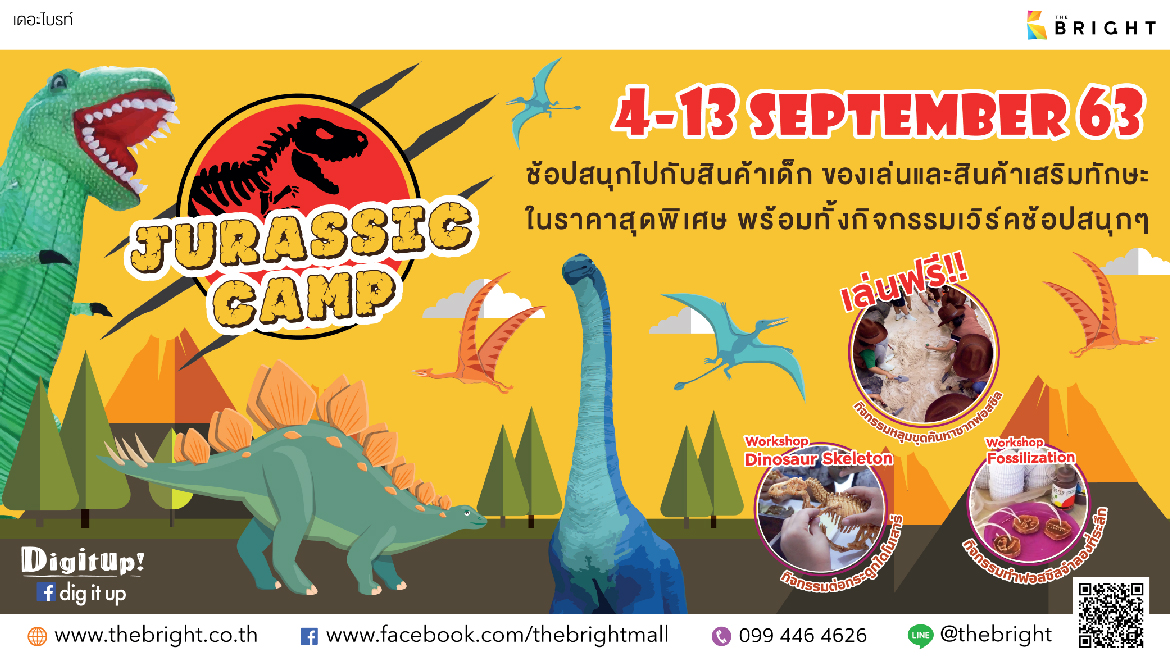 “JURASSIC CAMP” 4-13 SEPTEMBER 63 ช้อปสนุกไปกับสินค้าเด็ก ของเล่นและสินค้าเสริมทักษะในราคาสุดพิเศษ พร้อมทั้งกิจกรรมเวิร์คช้อปสนุกๆ เช่น เล่นฟรี!! กิจกรรมหลุมขุดดินหาซากฟอสซิล, Workshop Dinosaur Skeleton กิจกรรมต่อกระดูกไดโนเสาร์, Workshop Fossilization กิจกรรมทำฟอสซิลจำลองที่ระลึก เป็นต้น