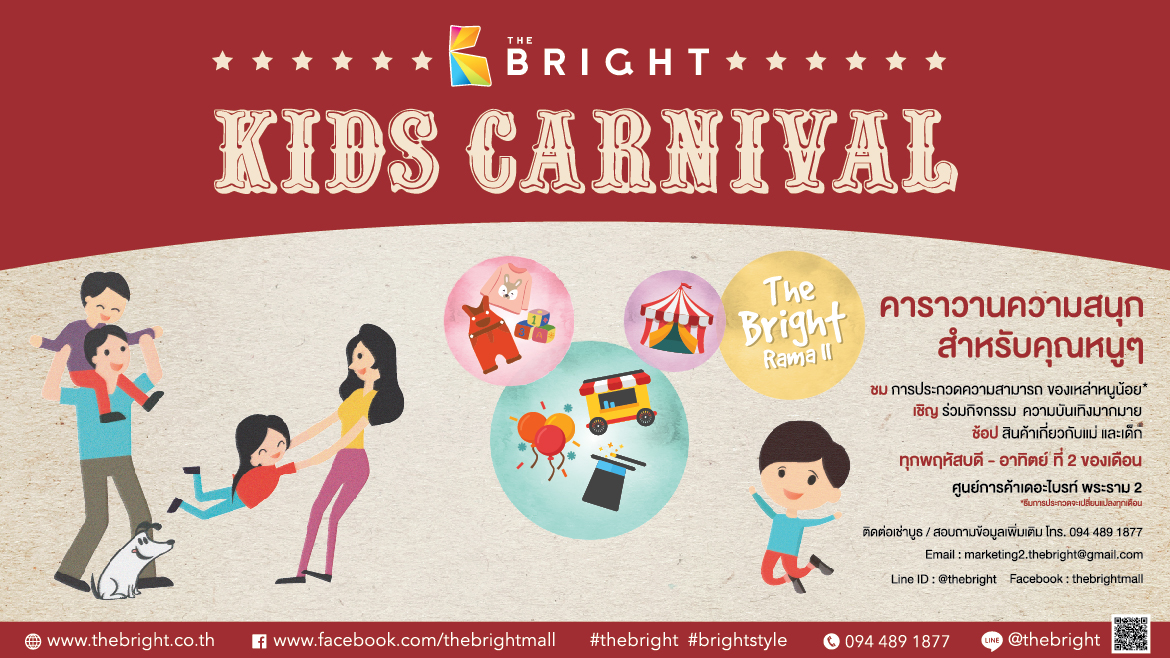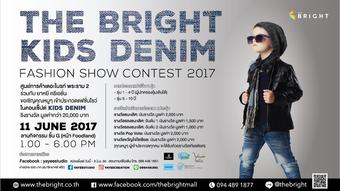“THE BRIGHT KIDS DENIM” FASHION SHOW CONTEST 2017 ศูนย์การค้าเดอะไบรท์ พระราม 2 ร่วมกับ ยาหยี ครีเอชั่น ขอเชิญคุณหนูๆ เข้าประกวดแฟชั่นโชว์ “ในคอนเซ็ปต์ KIDS DENIM” ชิงรางวัล มูลค่ากว่า 20,000 บาท ณ ลานกิจกรรม ชั้น G (หน้า Foodland) 1.00 – 6.00 PM