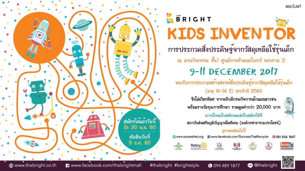 “KIDS INVENTOR” การประกวดสิ่งประดิษฐ์จากวัสดุเหลือใช้รุ่นเด็ก ณ ลานกิจกรรม ชั้น 1 พบกับการประกวดสร้างสรรค์สิ่งประดิษฐ์จากวัสดุเหลือใช้รุ่นเด็ก (อายุ 10-14 ปี) ประจำปี 2560 ชิงโล่เกียรติยศ จากอธิบดีกรมกิจการเด็กและเยาวชน พร้อมรางวัลทุนการศึกษา รวมมูลค่ากว่า 20,000 บาท