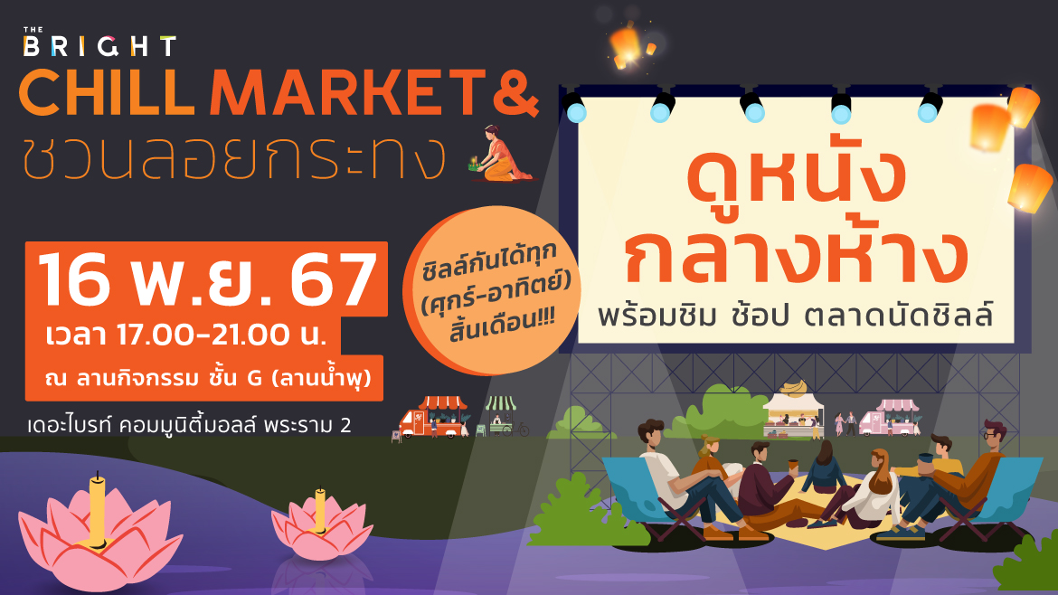 “THE BRIGHT CHILL MARKET ชวนลอยกระทง ดูหนังกลางห้าง” วันที่ 16 พฤศจิกายน 2567 เวลา 17.00 – 21.00 น. ณ ลานกิจกรรม ชั้น G (ลานน้ำพุ) พร้อมชิม ช้อป ตลาดนัด Chill กันได้ทุกวันศุกร์ – อาทิตย์ สิ้นเดือน