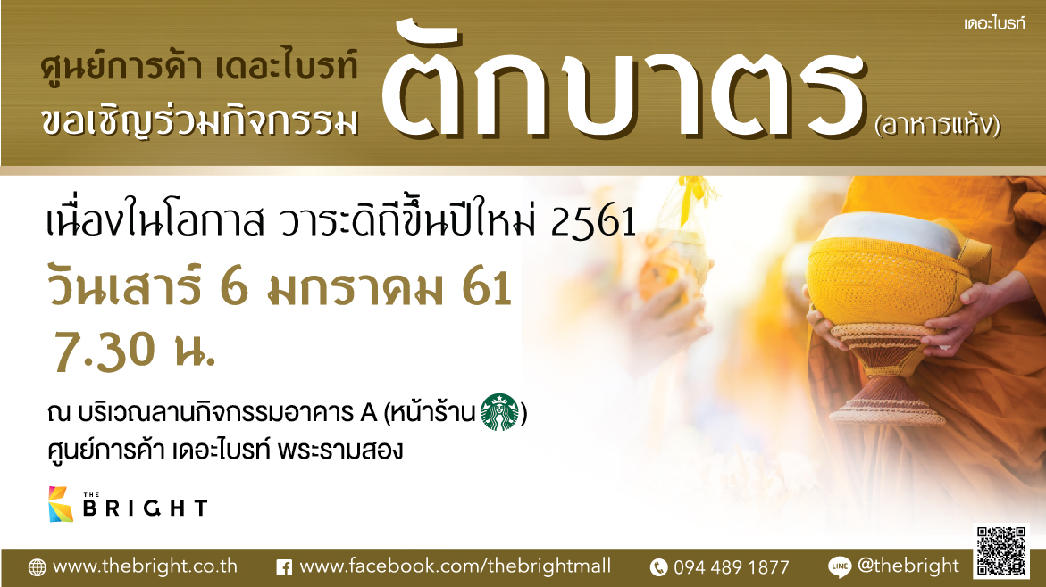 “ขอเชิญร่วมกิจกรรมตักบาตร (อาหารแห้ง)” เนื่องในโอกาส วาระดิถีขึ้นปีใหม่ 2561 วันเสาร์ 6 มกราคม เวลา 7.30 น. ณ บริเวณลานกิจกรรมอาคาร A (หน้าร้าน Starbucks coffee) ศูนย์การค้า เดอะไบรท์ พระรามสอง
