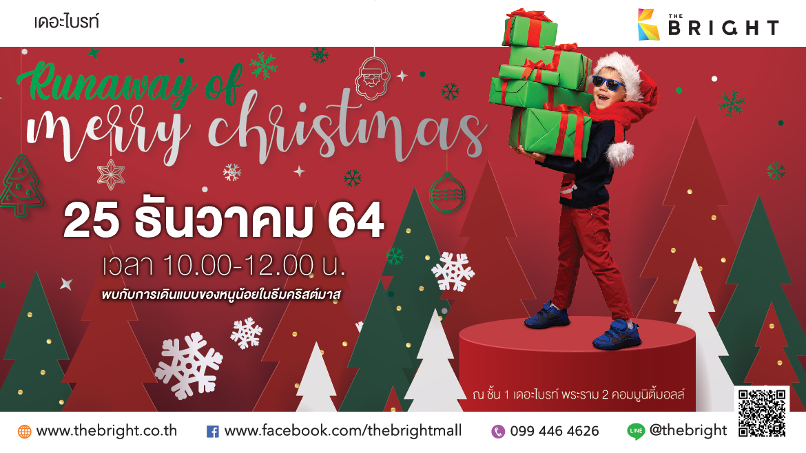“Runaway of Merry Christmas” 25 ธันวาคม 64 เวลา 10.00 – 12.00 น. พบกับการเดินแบบของหนูน้อยในธีมคริสต์มาส ณ ชั้น 1 เดอะไบรท์ พระราม 2 คอมมูนิตี้มอลล์