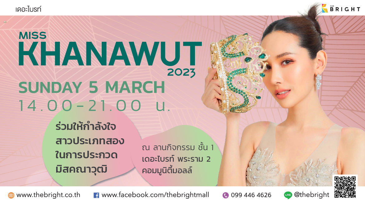 “MISS KHANAWUT 2023” ร่วมให้กำลังใจสาวประเภทสองในการประกวด “มิสคณาวุฒิ”  วันอาทิตย์ ที่ 5 มีนาคม 2023 เวลา 14.00 – 21.00 น. ณ ลานกิจกรรม ชั้น 1 เดอะไบรท์ พระราม 2 คอมมูนิตี้มอลล์