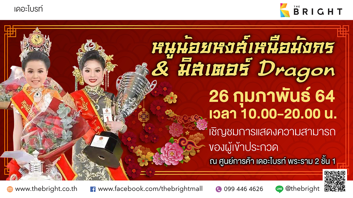 หนูน้อยหงส์เหนือมังกร & มิสเตอร์ Dragon 26 กุมภาพันธ์ 64 เวลา 10.00-20.00 น. เชิญชมการแสดงความสามารถของผู้เข้าประกวด ณ ศูนย์การค้าเดอะไบรท์ พระราม 2 ชั้น 1