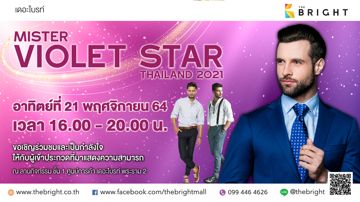 “MISTER VIOLET STAR THAILAND 2021” วันอาทิตย์ที่ 21 พฤศจิกายน 64 เวลา 16.00-20.00 น. ขอเชิญร่วมชมและเป็นกำลังใจให้กับผู้เข้าประกวดที่มาแสดงความสามารถ ณ ลานกิจกรรม ชั้น 1 ศูนย์การค้าเดอะไบรท์ พระราม 2
