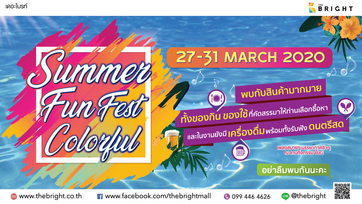 SUMMER FUN FEST COLORFUL 27-31 MARCH 2020 พบกับสินค้ามากมาย ทั้งของกินของใช้ที่คัดสรรมาให้ท่านเลือกซื้อหาและในงานยังมีเครืีองดื่มพร้อมทั้งรับฟังดนตรีสด เพลงสบายๆ บรรยากาศชิวๆ ณ ลานกิจกรรมชั้น G อย่าลืมพบกันนะคะ