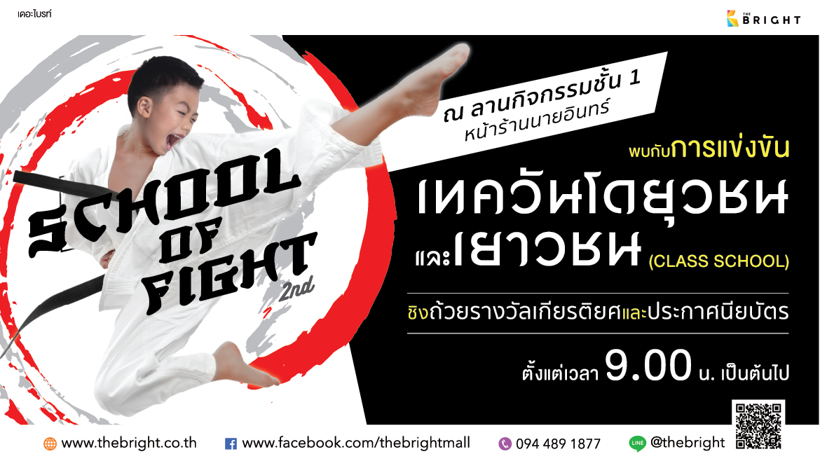 SCHOOL OF FIGHT 2nd พบกับการแข่งขันเทควันโดยุวชนและเยาวชน (CLASS SCHOOL) ชิงถ้วยรางวัลเกียรติยศและประกาศนียบัตร ตั้งแต่เวลา 9.00 น. เป็นต้นไป ณ ลานกิจกรรม ชั้น 1 หน้าร้านนายอินทร์