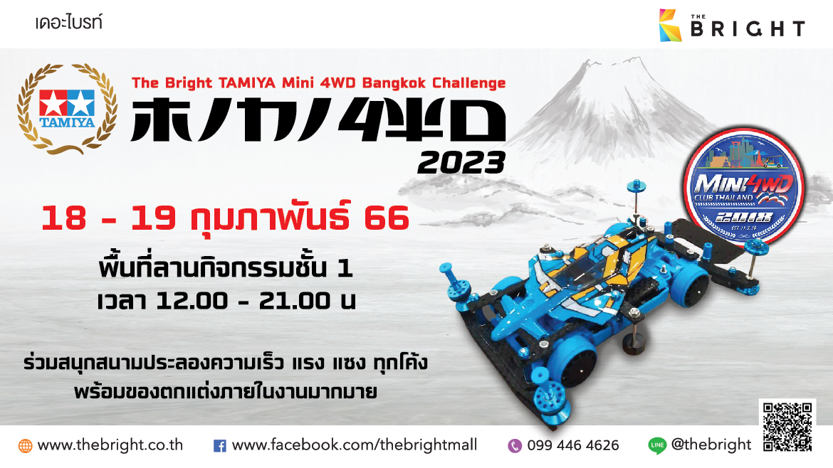 “The Bright TAMIYA Mini 4WD Bangkok Challenge 2023” วันที่ 18 – 19 กุมภาพันธ์ 2566 พื้นที่ลานกิจกรรม ชั้น 1 เวลา 12.00 – 21.00 น. ร่วมสนุก สนามประลองความเร็ว แรง แซง ทุกโค้ง พร้อมของตกแต่งภายในงานมากมาย