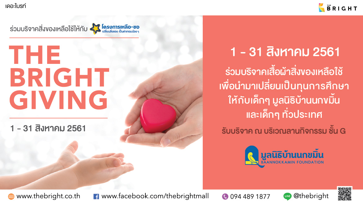 ร่วมบริจาคสิ่งของเหลือใช้ให้กับ โครงการเหลือ-ขอ เปลี่ยนสิ่งของเป็นค่าเทอมน้องๆ “THE BRIGHT GIVING” 1-31 สิงหาคม 2561 ร่วมบริจาคเสื้อผ้าสิ่งของเหลือใช้ เพื่อนำมาเปลี่ยนเป็นทุนการศึกษาให้กับเด็กๆ “มูลนิธิบ้านนกขมิ้น” และเด็กๆ ทั่วปประเทศ รับบริจาค ณ บริเวณลานกิจกรรม ชั้น G