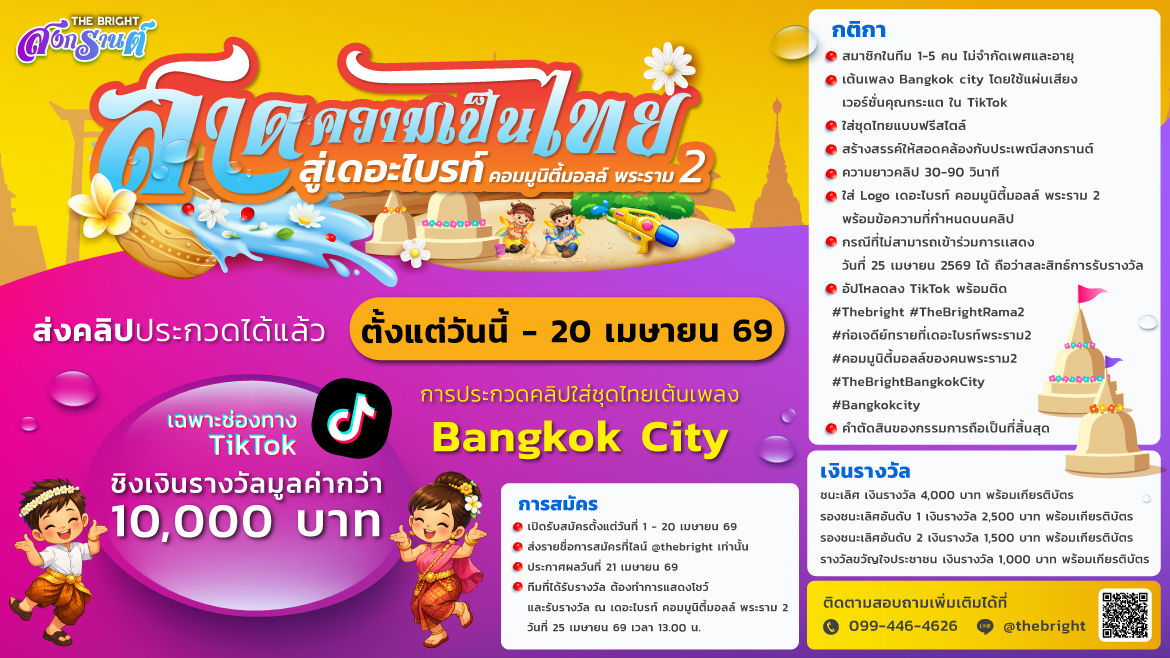 “THE BRIGHT สงกรานต์ สาดความเป็นไทย” ส่งคลิปประกวดได้แล้ว ตั้งแต่วันนี้ – 20 เมษายน 2569 การประกวดคลิปใส่ชุดไทยเต้นเพลง Bangkok City เฉพาะช่องทาง TiKTok ชิงเงินรางวัลมูลค่ากว่า 10,000 บาท ประกาศผลวันที่ 21 เมษายน 2569 ทีมที่ได้รับรางวัลต้องทำการแสดงโชว์และรับรางวัล ที่เดอะไบรท์ คอมมูนิตี้มอลล์ พระราม 2 วันที่ 25 เมษายน 2569 เวลา 13.00 น.