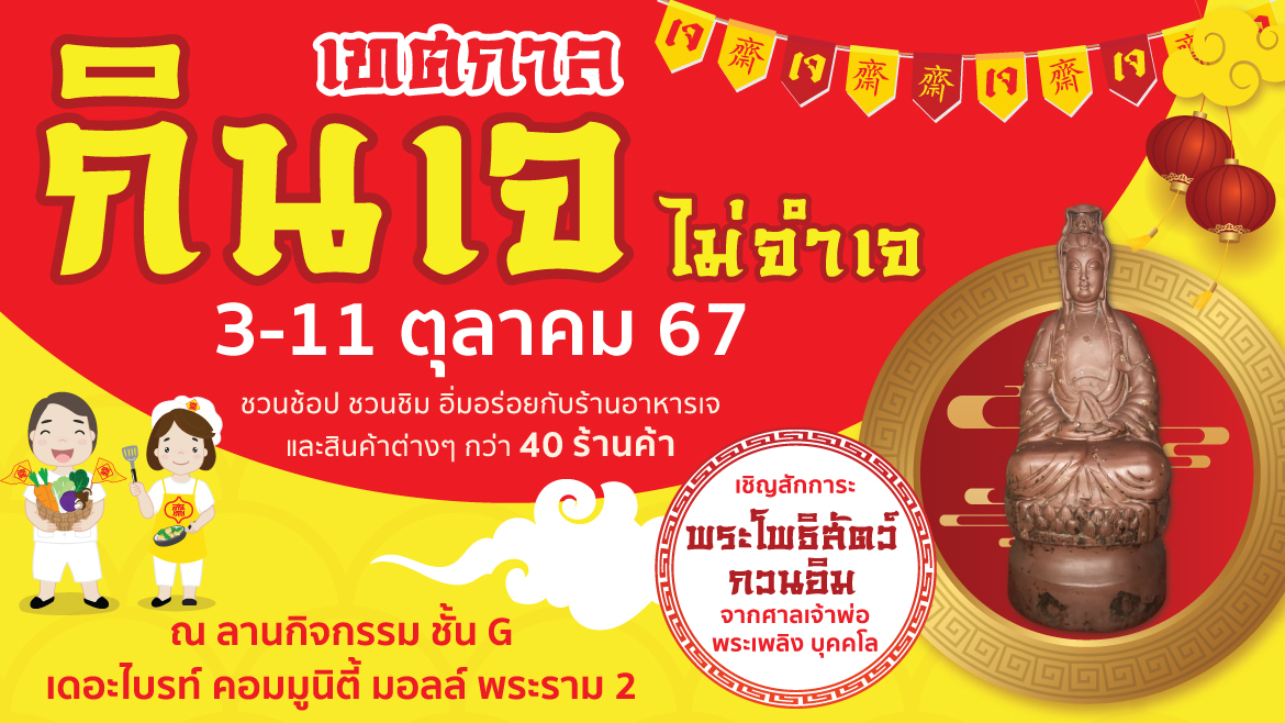 “เทศกาลกินเจ ไม่จำเจ” วันที่ 3-11 ตุลาคม 2567 เชิญสักการะ พระโพธิสัตว์กวนอิม จากศาลเจ้าพ่อพระเพลิง บุคคโล ชวนช้อป ชวนชิม อิ่มอร่อยกับร้านอาหารเจและสินค้าต่าง ๆ กว่า 40 ร้านค้า ณ ลานกิจกรรม ชั้น G เดอะไบรท์ คอมมูนิตี้ มอลล์ พระราม 2
