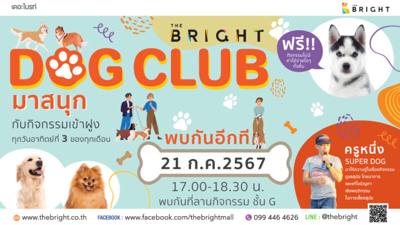 "THE BRIGHT DOG CLUB" มาสนุกกับกิจกรรม "เข้าฝูง" ทุกวันอาทิตย์ที่ 3 ของทุกเดือน "ฟรี!! ไม่มีค่าใช้จ่ายใด ๆ ทั้งสิ้น" ขอเชิญชวนทุกท่านนำน้องหมามาร่วมทำกิจกรรม ปรับพฤติกรรมพื้นฐาน ก่อนพาน้องหมาเที่ยวนอกบ้านพร้อมฝึกความสามารถเบื้องต้น โดย ครูหนึ่ง Super Dog มาให้ความรู้ในเรื่องกิจกรรมดูแลสุนัข โภชนาการและแก้ไขปัญหาเชิงพฤติกรรมในการเลี้ยงสุนัข พบกันอีกที วันที่ 21 กรกฎาคม 2567 เวลา 17.00 - 18.30 น. ที่เดอะไบรท์ พระราม 2 พบกันที่ลานกิจกรรม ชั้น G