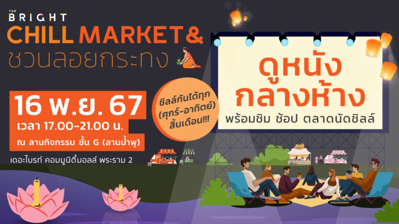"THE BRIGHT CHILL MARKET ชวนลอยกระทง ดูหนังกลางห้าง" วันที่ 16 พฤศจิกายน 2567 เวลา 17.00 - 21.00 น. ณ ลานกิจกรรม ชั้น G (ลานน้ำพุ) พร้อมชิม ช้อป ตลาดนัด Chill กันได้ทุกวันศุกร์ - อาทิตย์ สิ้นเดือน