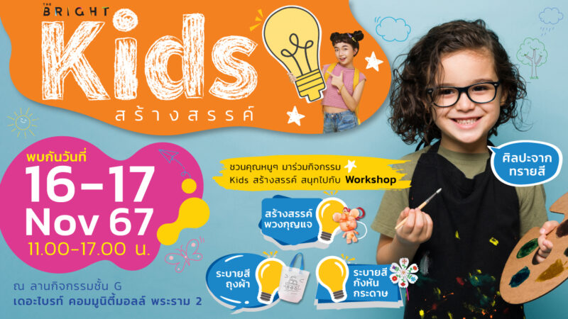 "THE BRIGHT KIDS" สร้างสรรค์ ชวนคุณหนู ๆ มาร่วมกิจกรรม Kids สร้างสรรค์ สนุกไปกับ Workshop สร้างสรรค์พวงกุญแจ ระบายสีถุงผ้า ระบายสีกังหันกระดาษ ศิลปะจากทรายสี พบกันวันที่ 16-17 พฤศจิกายน 2567 เวลา 11.00 - 17.00 น. ณ ลานกิจกรรม ชั้น G เดอะไบรท์ คอมมูนิตี้มอลล์ พระราม 2