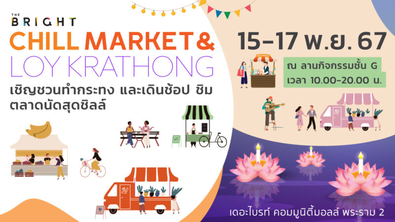 "THE BRIGHT CHILL MARKET & LOY KRATHONG DAY"เชิญชวนทำกระทง และเดินช้อป ชิม ตลาดนัดสุด Chill วันที่ 15-17 พฤศจิกายน 2567 ณ ลานกิจกรรม ชั้น G เวลา 10.00 - 20.00 น. เดอะไบรท์ คอมมูนิตี้มอลล์ พระราม 2