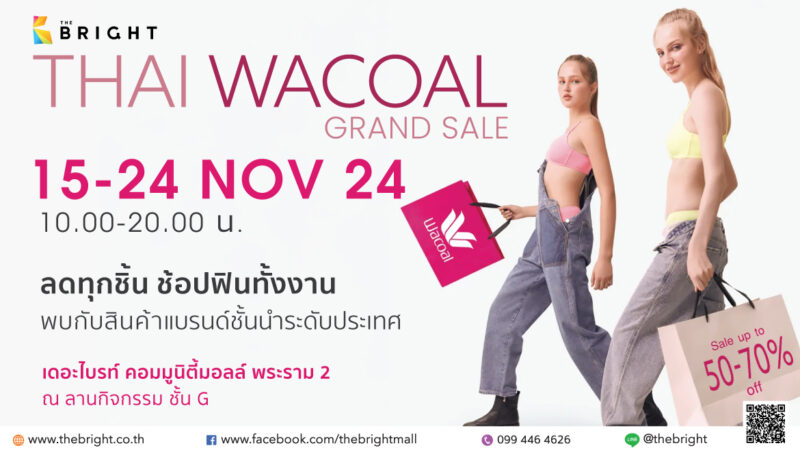 "THAI WACOAL GRAND SALE" วันที่ 15-24 พฤศจิกายน 2024 เวลา 10.00 - 20.00 น. ลดทุกชิ้น ช้อปฟินทั้งงาน พบกับสินค้าแบรนด์ชั้นนำระดับประเทศ ที่เดอะไบรท์ คอมมูนิตี้มอลล์ พระราม 2 ณ ลานกิจกรรม ชั้น G
