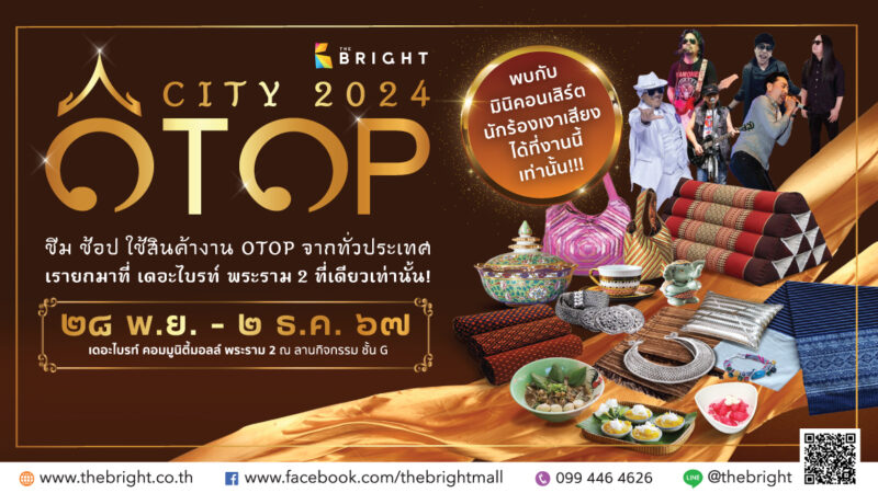 "OTOP CITY 2024" ชิม ช้อป ใช้สินค้างาน OTOP จากทั่วประเทศ เรายกมาที่ เดอะไบรท์ พระราม 2 ที่เดียวเท่านั้น พบกับ มินิคอนเสริ์ต นักร้องเงาเสียงได้ที่งานนี้เท่านั้น!! วันที่ ๒๘ พฤศจิกายน - ๒ ธันวาคม ๒๕๖๗ เดอะไบรท์ คอมมูนิตี้มอลล์ พระราม 2 ณ ลานกิจกรรม ชั้น G